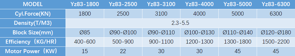 Particle shape castiron powder,high grade of ductile cast iron,alloy,steel,copper othermetal filings can be cold pressed to cylindrical by Series briquetting press,with density of 5.5-6ton/m3(adhtsion agent is not used) production of 8-20 tons is every shift. Tht machine is ofa vertical structure with upper lower beams made of cast steel, it outputs block automatically once feededwith materials. it also can be equipped with different circulation cooling systems.Single person operation is the initiative in domestic.